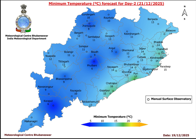 ଭୁବନେଶ୍ବର: ଶୀତରେ ଥରୁଛି ସାରା ରାଜ୍ୟ। ଅସହ୍ୟ ଶୀତ ଲହରୀ ଜାରି ରହିଛି । ପାରଦ ତଳମୁହାଁ ଯୋଗୁଁ ସାରା ରାଜ୍ୟ ଜାଡ଼ରେ ଥରୁଛି । ୧୦ ସହରର ତାପମାତ୍ରା ୧୦ ଡିଗ୍ରୀ ତଳେ ରହିଛି । ଆଗାମୀ ୭ ଦିନ ଯାଏଁ ତାପମାତ୍ରାରେ ପରିବର୍ତ୍ତନ ହେବାର ସମ୍ଭାବନା ନାହିଁ । ଅର୍ଥାତ ୭ ଦିନ ପ୍ରବଳ ଥଣ୍ଡା ପଡ଼ିବ । ସେହିପରି ଘନ କୁହୁଡ଼ିକୁ ନେଇ ପାଣିପାଗ ବିଭାଗ ୱାର୍ଣ୍ଣିଂ ଜାରି କରିଛି । ଆଗାମୀ ୨ ଦିନ ଘନ କୁହୁଡ଼ି ଦୃଶ୍ୟମାନ ହେବା ବୋଲି ପାଣିପାଗ ବିଭାଗ ପୂର୍ବାନୁମାନ କରିଛି । ଏନେଇ ଆସନ୍ତାକାଲି (୨୦ ତାରିଖ) ପାଇଁ ୪ ଜିଲ୍ଲା ଓ ୨୧ ଡିସେମ୍ବର ପାଇଁ ୩ ଜିଲ୍ଲାକୁ ୟେଲୋ ୱାର୍ଣ୍ଣିଂ ଜାରି କରାଯାଇଛି । ୨୦ ଡିସେମ୍ବରରେ କନ୍ଧମାଳ, ସମ୍ବଲପୁର, ଝାରସୁଗୁଡ଼ା ଓ ସୁନ୍ଦରଗଡ଼ରେ ଭୀଷଣ ଶୀତ ହେବ।୨୧ ଡିସେମ୍ବରରେ ସମ୍ବଲପୁର, ଝାରସୁଗୁଡ଼ା ଓ ସୁନ୍ଦରଗଡ଼କୁ ୟେଲୋ ୱାର୍ଣ୍ଣିଂ ଜାରି ହୋଇଛି। ସେହିପରି କୋରାପୁଟ, କନ୍ଧମାଳ, କଳାହାଣ୍ଡି, ସମ୍ବଲପୁର, ଝାରସୁଗୁଡ଼ା ଓ ସୁନ୍ଦରଗଡ଼ ଜିଲ୍ଲାରେ ଅନେକ ସ୍ଥାନରେ ବିଶେଷ କରି ସକାଳ ସମୟରେ କୁହୁଡ଼ି ଦୃଶ୍ୟମାନ ହେବାକୁ ଥିବା ବେଳେ ସତର୍କତା ଜାରି କରିଛି ପାଣିପାଗ ବିଭାଗ । ସେପଟେ ଆଗାମୀ ୭ ଦିନ ପର୍ଯ୍ୟନ୍ତ ସର୍ବନିମ୍ନ ତାପମାତ୍ରାରେ ବିଶେଷ ପରିବର୍ତ୍ତନ ହେବାର ସମ୍ଭାବନା ନାହିଁ । ଫଳରେ ଆଗାମୀ ୭ ଦିନ ଯାଏଁ ଏଭଳି ଶୀତର ପ୍ରକୋପ ଲାଗି ରହିବ । ପାଣିପାଗ ବିଭାଗର ପୂର୍ବାନୁସାରେ କୋରାପୁଟ ୬ ଡିଗ୍ରୀ, ଫୁଲବାଣୀ ୭ ଡିଗ୍ରୀ, ଝାରସୁଗୁଡ଼ା ୮ ଡିଗ୍ରୀ, ବୌଦ୍ଧ ୯ ଡିଗ୍ରୀ, ଅନୁଗୋଳ ୯ ଡିଗ୍ରୀ, ନବରଙ୍ଗପୁର ୯ ଡିଗ୍ରୀ, ସୁନ୍ଦରଗଡ଼ ୧୦ ଡିଗ୍ରୀ, ଭବାନୀପାଟଣା ୧୦ ଡିଗ୍ରୀ, ରାୟଗଡ଼ା ୧୦ ଡିଗ୍ରୀ ଓ ରାଉରକେଲାରେ ୧୦ ଡିଗ୍ରୀ ତାପମାତ୍ରା ରହିବ। ସେପଟେ ଆଜି (ଡିସେମ୍ବର ୧୯) ଏବଂ ଆସନ୍ତାକାଲି (୨୦ ତାରିଖ)ରେ ଓଡ଼ିଶା ସହ ପଞ୍ଜାବ, ଉତ୍ତରାଖଣ୍ଡ ଏବଂ ବିହାରରେ ଘନରୁ ଅତ୍ୟନ୍ତ ଘନ କୁହୁଡ଼ି ହେବାର ପୂର୍ବାନୁମାନ କରିଥି ପାଣିପାଗ ବିଭାଗ । ଉତ୍ତରପ୍ରଦେଶ ଏବଂ ହରିୟାଣାରେ ମଧ୍ୟ ସକାଳ ସମୟରେ ଅତ୍ୟନ୍ତ ଘନ କୁହୁଡ଼ି ପଡ଼ିବ । ଆଗାମୀ ଦୁଇରୁ ତିନି ଦିନ ପର୍ଯ୍ୟନ୍ତ, କୁହୁଡ଼ି ସ୍ଥିତି ଲାଗି ରହିବ । ପାଣିପାଗ ବିଭାଗ ପକ୍ଷରୁ କୁହାଯାଇଛି ଯେ, କୁହୁଡ଼ି ସମୟରେ ଦୃଶ୍ୟମାନତା ଦୂରତା ହ୍ରାସ ହେବ, ଯାହା ବିପଦ ସୃଷ୍ଟି କରିପାରେ । ତେଣୁ ଯାତାୟତ ସମୟରେ ଗାଡ଼ି ଧୀରେ ଚଲାଇବା ସହ ହେଡଲାଇଟ୍ ଏବଂ ଫଗ୍ ଲାଇଟ୍ ଜାଳି ରଖିବା, ଅନାବଶ୍ୟକ ଯାତ୍ରା ଏଡାଇବା ପାଇଁ ପରାମର୍ଶ ଦେଇଛି ବିଭାଗ । ଗତ ୨୪ ଘଣ୍ଟା ମଧ୍ୟରେ ଫୁଲବାଣୀରେ ସର୍ବନିମ୍ନ ତାପମାତ୍ରା ୬.୫ ଡିଗ୍ରୀ ରେକର୍ଡ ହୋଇଥିବା ବେଳେ ସର୍ବାଧିକ ତାପମାତ୍ରା ପାରଳାଖେମୁଣ୍ଡିରେ ୩୦.୨ ଡିଗ୍ରୀ ରେକର୍ଡ ହୋଇଛି।